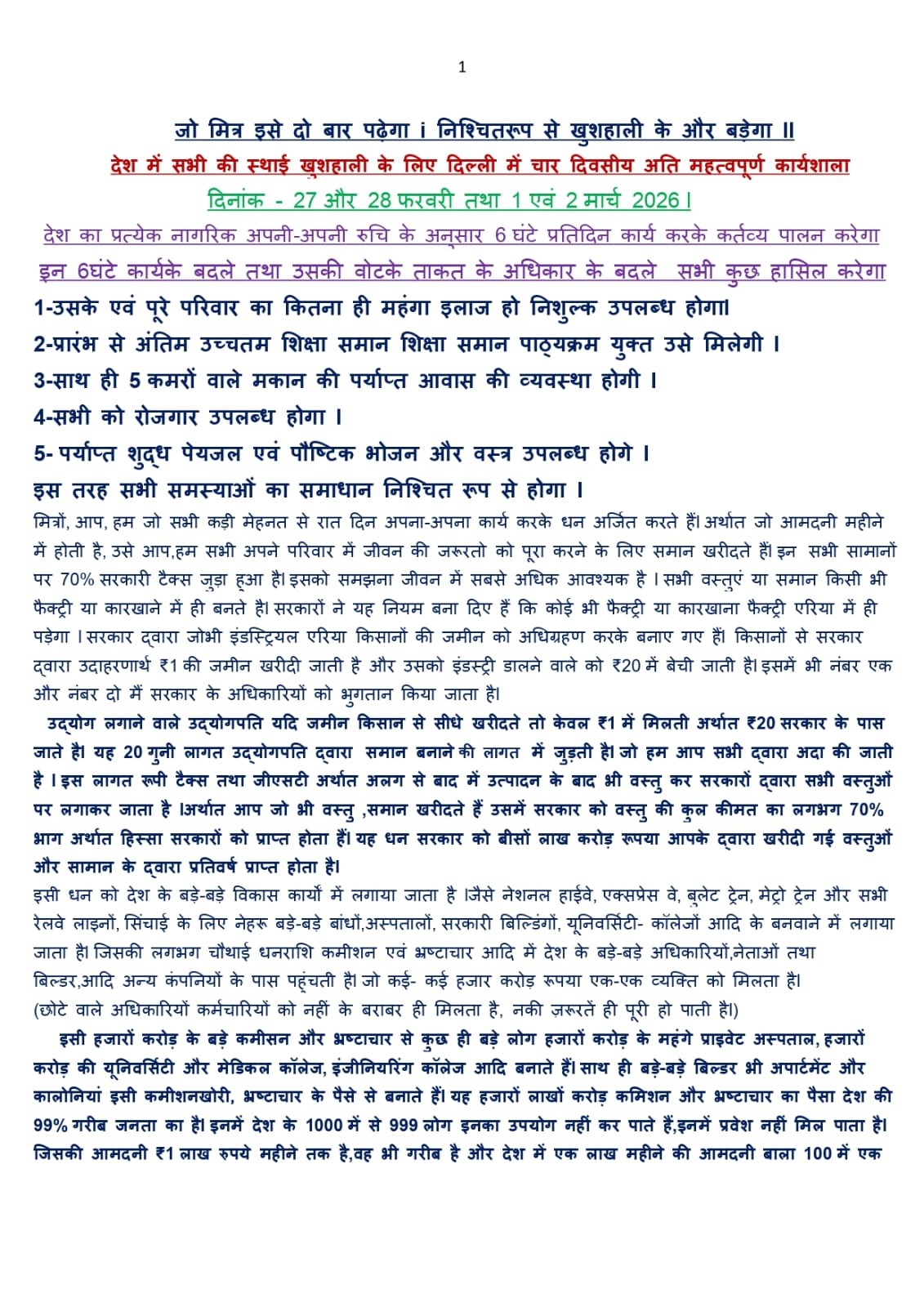 प्रिय मित्रों, देश में प्रत्येक गरीब से गरीब व्यक्ति अपनी कठोर मेहनत की कमाई का लगभग 60% टैक्स सरकार को देता है, क्योंकि प्रत्येक वस्तु पर जीएसटी अर्थात वस्तुकर लगा हुआ हैl वस्तु उत्पादन फैक्टरी कारखाने से होता है उसमें जमीन की रजिस्ट्री अर्सेथात सरकारें किसानोंकी जमीने यदि 1 रुपये में खरीदती हैं और फेक्ट्री एरिया बनाती है वह जमीन या फेक्टरी का प्लाट फेक्टरी डालने बाले को 10 रुपये में पड़ता है ,यदि फेक्ट्री मालिक किसान से सीधे डाइरेक्ट जमीन खरीदता तो 9 रुपये की लागत नही लगती यह लागत फेक्ट्री में बनी बस्तु की लागत में जुड़ती जुड़ेगी हीइस 9 रुपयों की लागत जोड़कर ही बस्तु की कीमत तय होगी या सरकार के किसी खास पूंजीपति को औद्योगिक क्षेत्र अर्थात इंडस्ट्रीयल एरिया घोषित होने से पहले ही बता दिया जाता है की आप इस जमीन को खरीद ले हम यहाँ इंडस्ट्रीयल एरिया बनाने जा रहे हैं इस तरह अपने खास चहेते को वह जमीन खारीवा दी जाती है उसके बाद उस जमीन को इंडस्ट्रीयल एरिया घोषित कर उसे बड़ा लाभ पहुंचाया जाता है | उसके बाद वह 1 रुपये में जमीन खरीदता है और सरकार से कई गुना मुआवजा हासिल करता है |सके बाद फेक्टरी की बिल्डिंग में लगे मैटेरियल ईंट, सीमेंट, लोहा ,मशीन सभी में ऑलरेडी(पहले से ही) जीएसटी दो-दो बार सरकार के पास चली जाती हैl उसके बाद फैक्ट्री में जो सामान बनता है,उस पर पुनः तीसरी और चौथी बार जीएसटी लगती हैl इस तरह प्रत्येक वस्तु पर लगभग 60% जीएसटी लगी हुई है, जो सरकार के पास जाती हैl वह लाखों करोड़ में इकट्ठी होती है | उसमें से जो केंद्रीय सत्ता वाले कुछ ही बड़े भ्रष्ट लोग डेवलपमेंट में उस फंड को लगाते हैंl बड़ी मात्रा में लाखों करोड़ रूपया विदेशी कर्ज विश्व बैंक आदि से लेकर विकास कार्यों में लगाते हैं | नॅशनल हाईवे,सड़के, ,नहरे, डेम्स , हवाई अड्डे, मेट्रो ट्रेन्स ,बुलेट ट्रेन्स आदि डेवलपमेंट में पचासों हजार करोड़ों की कुछ ही लोग कमीशन खोरी करके संपत्ति एकत्रित कर लेते हैंl इस संपत्ति से प्राइवेट सेक्टर के बड़े महंगे अस्पताल ,महंगे,मेडिकल कॉलेज औरमहंगे इन्गिनिअरिंग कालेज ,MBA,MCA कालेज एवं शिक्षा संसथान , बिल्डरमहँगी कालोनियां बनाते हैं जो देश के हजार में से एक भी व्यक्ति जिसकी आमदनी एक लाख रुपये है, इन का पचासों लाख का भुगतान नहीं कर सकता जब की यही लोग जी एस टी का 99 % भुगतान करते हैं|यही एक हजार में 999 लोग गंभीर बीमारीमें पच्चासों लाख के महंगे इलाज नहीं करा सकते,ना ही पचासों लाख के महंगे फ़्लैट महँगी कालोनियों में सकते, ,ना ही पचासों लाख की महंगी शिक्षा ग्रहण कर सकते हैं ll यह पैसा आपका ही है lइस भ्रष्टाचार, कमीशन खोरी शोषण ,अत्याचार,अन्याय अपमान से बचने के लिए संगठित होइए lइसीलिए "भारतीय मताधिकार शक्ति महासंघ,राष्ट्रीय 